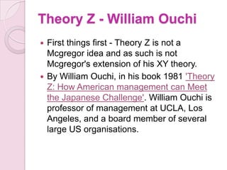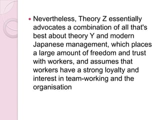 4. McGregor's Theory X and Y describe different views of employee motivation, with Theory Y assuming employees want responsibility and are self-motivated, leading to better performance.