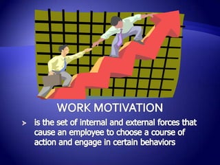 This document discusses various theories and models of work motivation. It begins by defining work motivation and outlining three elements: direction and focus of behavior, level of effort, and persistence of behavior. It then presents Maslow's hierarchy of needs and Herzberg's two-factor theory, distinguishing between motivational and maintenance factors. The document also introduces expectancy theory, focusing on valence, expectancy, and instrumentality. Additional models covered include the equity model, goal setting theory, reinforcement approaches in behavior modification, and Alderfer's ERG theory.