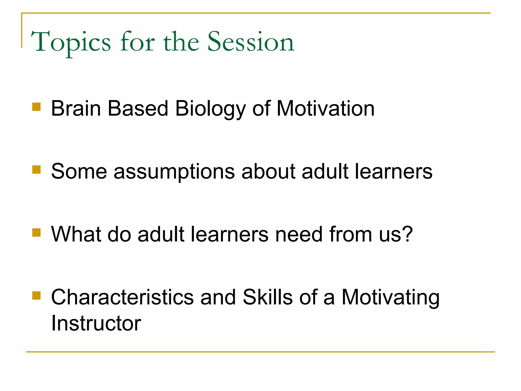 The document discusses adult motivation to learn and characteristics of motivating instructors. It explains that learning and motivation are brain-based and influenced by neural connections. Adult learners are pragmatic but also intrinsically motivated, and they need a culturally responsive learning environment that establishes inclusion, enhances meaning, and engenders competence. Motivating instructors display expertise, empathy, enthusiasm, clarity, and cultural responsiveness to positively influence adult learner motivation.