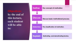 Motivation refers to the factors that energize and direct behavior. There are internal and external motivators. Basic motivational processes involve needs and drives like hunger, thirst, sex, and pain avoidance. Maslow's hierarchy of needs categorizes human motivations. Motivating factors include recognition, respect, interesting work, listening, and empowering others. Demotivating factors are unfair criticism, negative criticism, rewarding non-performers, fear of failure, complacency from success, lack of direction, and low self-esteem. The greatest motivator is self-motivation through belief in one's own responsibility for actions.