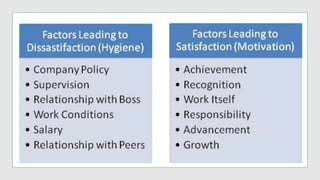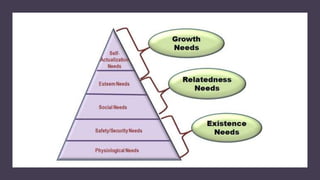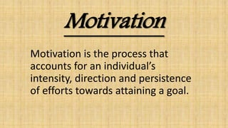 Motivation accounts for an individual's effort, direction, and persistence towards goals. There are three aspects of motivation: effort, direction, and persistence. Motivation theories are classified into content/need theories, which examine what motivates behavior, and process theories, which examine how content influences behavior. Key content theories include Maslow's hierarchy of needs, Herzberg's two-factor theory, and Alderfer's ERG theory. Process theories include Vroom's expectancy theory and equity theory. Motivation is important for productivity, change management, resource utilization, satisfaction, and goal achievement in organizations.