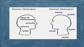 This document discusses different concepts and theories of motivation. It defines intrinsic and extrinsic motivation and explores drive theory, instinctual behavior theory, and cognitive approaches. Drive theory proposes that biological drives increase over time if not satisfied, motivating goal-directed actions. Instinctual behavior theory examines inborn tendencies and social instincts. Cognitive approaches emphasize expectations and subjective interpretations of reality in motivating behavior. Theories of motivation can be used to relate biology to behavior, account for variability, infer internal states, assign responsibility, and explain perseverance. Motivation is the internal force directing behavior and governing how people live.