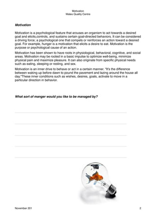 This document provides information about motivation from several perspectives. It begins with definitions of motivation and discusses physiological, behavioral, cognitive and social roots of motivation. It then provides exercises for participants to consider how to increase and decrease motivation in a work context. The remainder of the document outlines various theories and models of motivation, including: intrinsic and extrinsic motivation; operant conditioning; push and pull factors; self-control; drives; incentive theory; and cognitive dissonance theory.