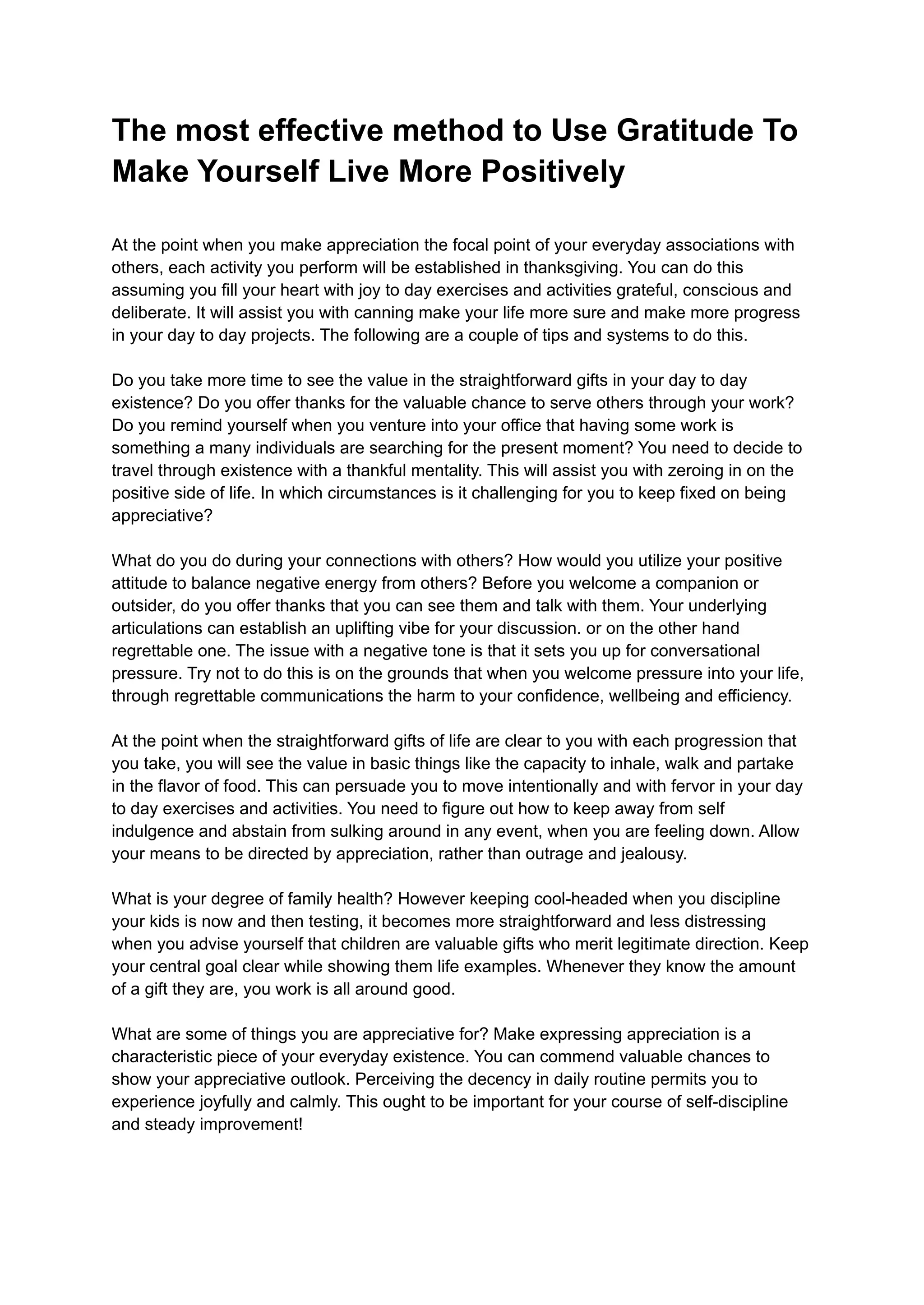 The document emphasizes the importance of adopting a grateful mindset to foster a positive and successful life. It suggests that expressing gratitude in daily interactions and recognizing life's simple gifts can enhance well-being and motivate intentional actions. Practical tips are given to incorporate gratitude into everyday routines, highlighting its role in improving relationships and personal development.