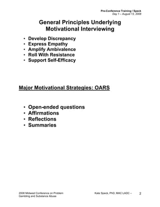 This document provides information from a training on Motivational Interviewing conducted by Kate Speck. It includes a questionnaire to test understanding of Motivational Interviewing concepts, the general principles and major strategies of Motivational Interviewing including OARS (Open-ended questions, Affirmations, Reflections, Summaries). It also provides guidance on how to conduct Motivational Interviews, including setting the agenda, exploring pros and cons of behavior, discussing life goals, and techniques for responding to change talk and resistance.