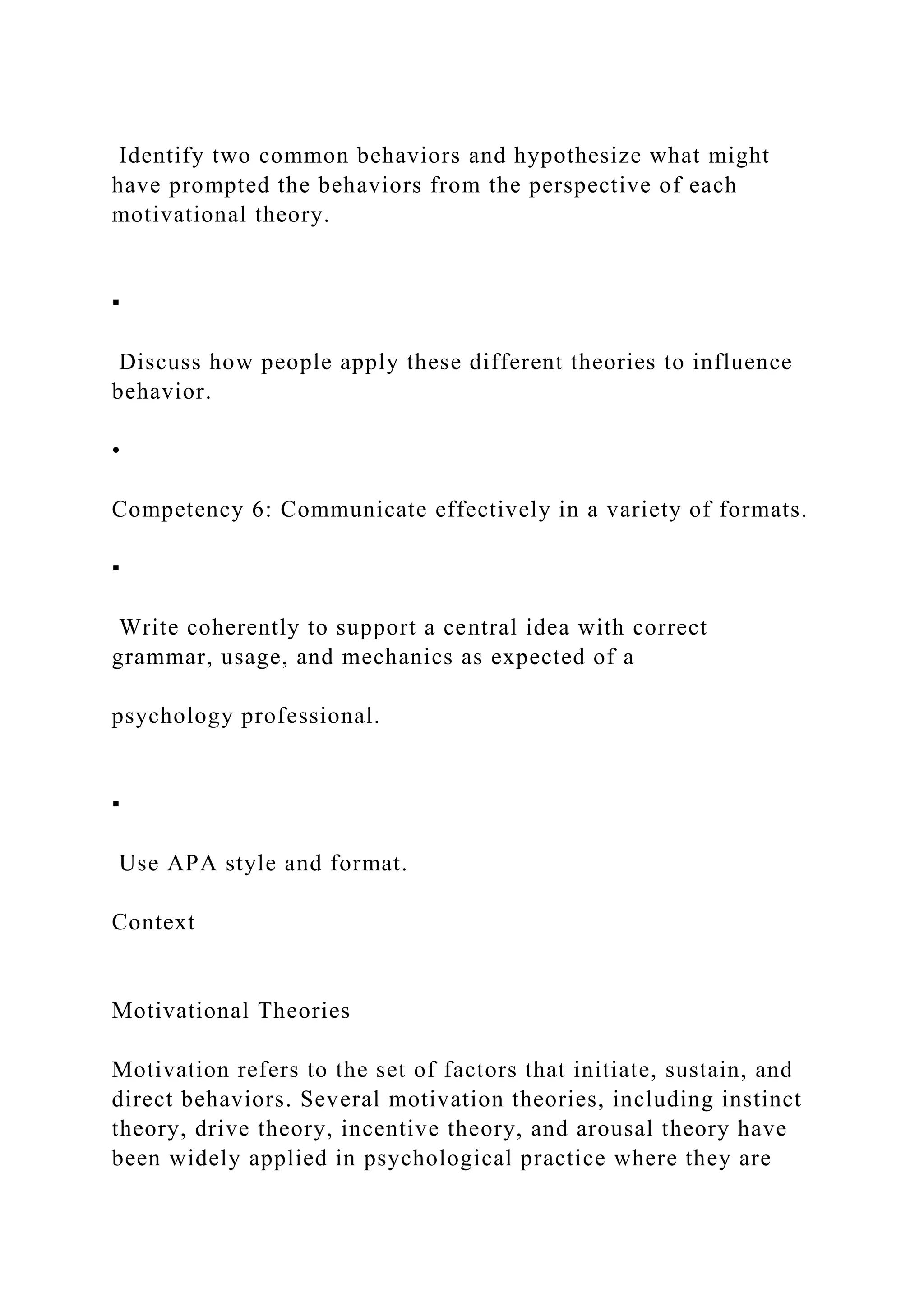 The document provides an overview of motivational and memory acquisition theories, along with an assessment task that involves applying these theories to behaviors and memory systems. It outlines required competencies, including the use of information technology, evaluation of psychological issues, and effective communication. Additionally, it discusses emotion, memory disorders such as amnesia, and the significance of understanding motivation in psychological practice.