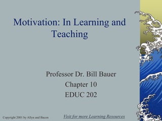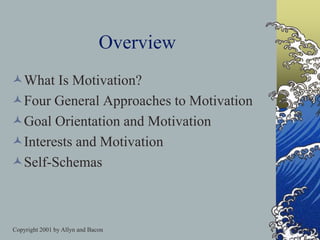 This chapter discusses motivation from multiple perspectives including behavioral, humanistic, cognitive, and sociocultural approaches. It covers topics such as goal orientation, interests and emotions, and self-schemas. The key aspects of motivation discussed are its definition as an internal state that arouses and directs behavior, distinctions between intrinsic and extrinsic motivation, and the importance of goals, self-efficacy, and beliefs on motivation. The chapter provides teachers with strategies for improving student motivation based on these psychological theories.