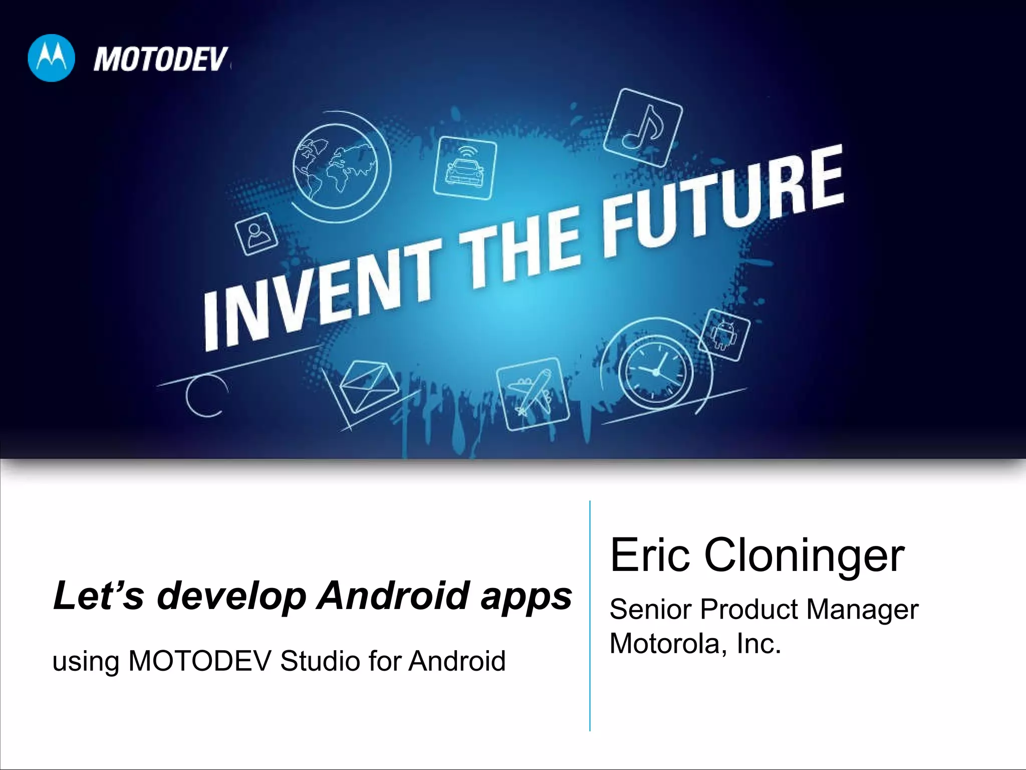 The document discusses using MOTODEV Studio for Android app development. It recommends exercising due diligence, making smart design choices, playing nice with others, participating in developer communities, and using the right tools for the job. MOTODEV Studio is an Eclipse-based IDE designed to support the full Android development lifecycle and Motorola devices. It provides an out-of-the-box experience for configuring SDKs and debugging on emulators and devices.