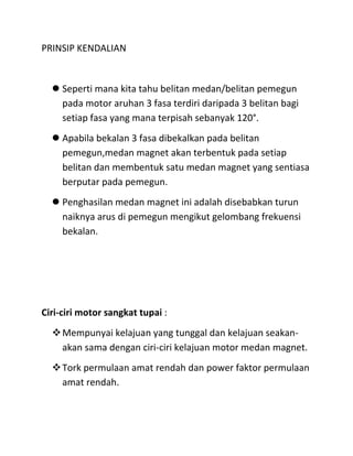 Dokumen ini membahas tiga jenis motor elektrik: motor sangkar tupai, motor rotor berlilit, dan motor segerak, termasuk prinsip kerja dan karakteristik masing-masing. Motor sangkar tupai memiliki kelajuan tetap dengan tork rendah, sementara motor rotor berlilit memungkinkan pengendalian kelajuan dengan resistansi eksternal tetapi dengan efisiensi rendah. Motor segerak beroperasi dengan kelajuan tetap dan memerlukan penggerak eksternal, sering digunakan di industri untuk meningkatkan faktor daya dan menjalankan mesin tertentu.