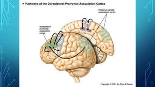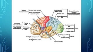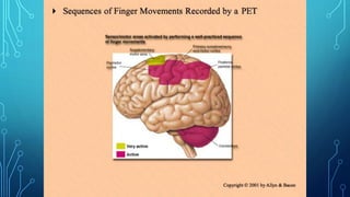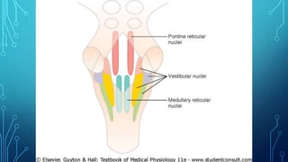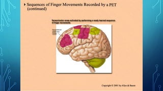 The document summarizes the key motor areas and pathways in the brain that control voluntary movement. It discusses the primary motor cortex, premotor cortex, and supplementary motor area that project to the spinal cord to control muscle movement. The basal ganglia and cerebellum also integrate with these motor areas to coordinate complex movements and ensure smooth motor execution. Damage to different motor areas can impact abilities like fine motor control, bimanual coordination, or lead to conditions like tremors or rigidity.