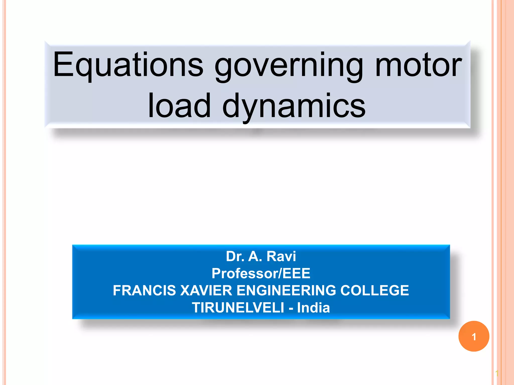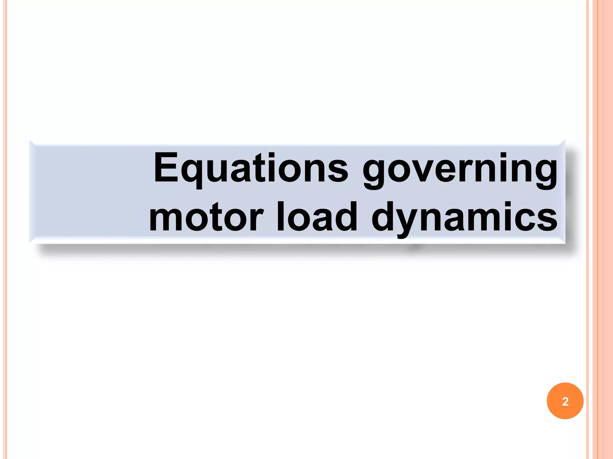 This document discusses equations governing the dynamics of a motor load system. It defines key terms like moment of inertia (J), angular velocity (ωm), motor torque (T), and load torque (Tl). It explains that during acceleration, the motor supplies the load torque plus an additional torque (Jdωm/dt) to overcome inertia. Load torques can include friction torque (TF), windage torque (Tw), and torque required for useful work (TL). Load torques are classified as either active if they can drive the motor, or passive if they always oppose motion. Different load types can have torque proportional to speed, speed squared, or inversely with speed.