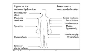 This document provides information on motor neuron disease and amyotrophic lateral sclerosis (ALS) in particular. It discusses the pathology, classification, clinical manifestations, investigations, differential diagnosis and treatment of motor neuron diseases with a focus on ALS. ALS is characterized by the degeneration of both upper and lower motor neurons leading to muscle weakness, atrophy and fasciculations. Riluzole and edaravone are approved treatments that can modestly prolong survival.