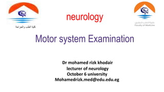 This document summarizes the steps for performing a thorough motor system examination. It outlines how to inspect muscles for wasting, deformities, involuntary movements, and trophic changes. It describes how to assess muscle tone, power, coordination, reflexes, and gait. Abnormal findings are defined, including pathological reflexes like Babinski's sign. The exam involves a full evaluation of muscle and nerve function in the upper and lower limbs as well as the trunk.