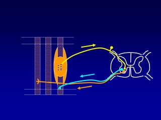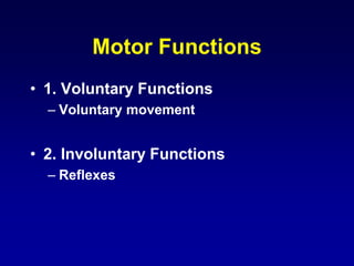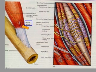 This document discusses motor reflexes and their components. It begins by defining reflexes as involuntary responses to stimuli that do not involve significant brain involvement. It then discusses the stretch reflex in detail, including the roles of muscle spindles, Ia afferent fibers, and alpha and gamma motor neurons. Additional reflexes discussed include withdrawal reflexes, reciprocal innervation, and primitive reflexes seen in infants. The clinical importance of assessing reflexes to localize lesions in the motor system is also mentioned.