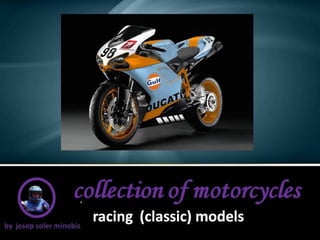 The document details the motorsport career and interests of Josep Soler Minobis, who has a strong background in car and motorcycle racing, including participation in prestigious events. It outlines his involvement in marketing for the AJR motorcycle brand during the 2011 and 2012 world championship seasons. Additionally, it showcases a collection of classic racing motorcycles from various renowned manufacturers.