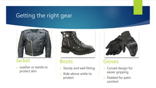 This document provides a beginner's guide to getting started with motorcycle riding. It outlines the important gear needed like leather or textile jackets, sturdy boots that ride above the ankle, and gloves with curved designs for gripping. Helmets are also discussed as being required by law in some states and can protect the head from injury. The guide recommends taking a motorcycle safety course which includes classroom and riding portions to learn basic controls like the throttle, brakes, clutch, and shifter. It provides tips for ensuring the bike is a proper fit and how to properly turn, slow down, and stop the motorcycle.