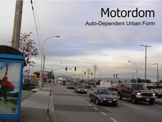 The document discusses the concept of 'motordom,' which refers to urban design heavily reliant on automobiles, resulting in low-density, auto-oriented environments. It critiques the reliance on car-centric planning and suggests alternative urban mobility options, highlighting the need for sufficient density and mixed-use development. Additionally, it emphasizes the importance of adapting urban infrastructure to be resilient and sustainable for future generations.