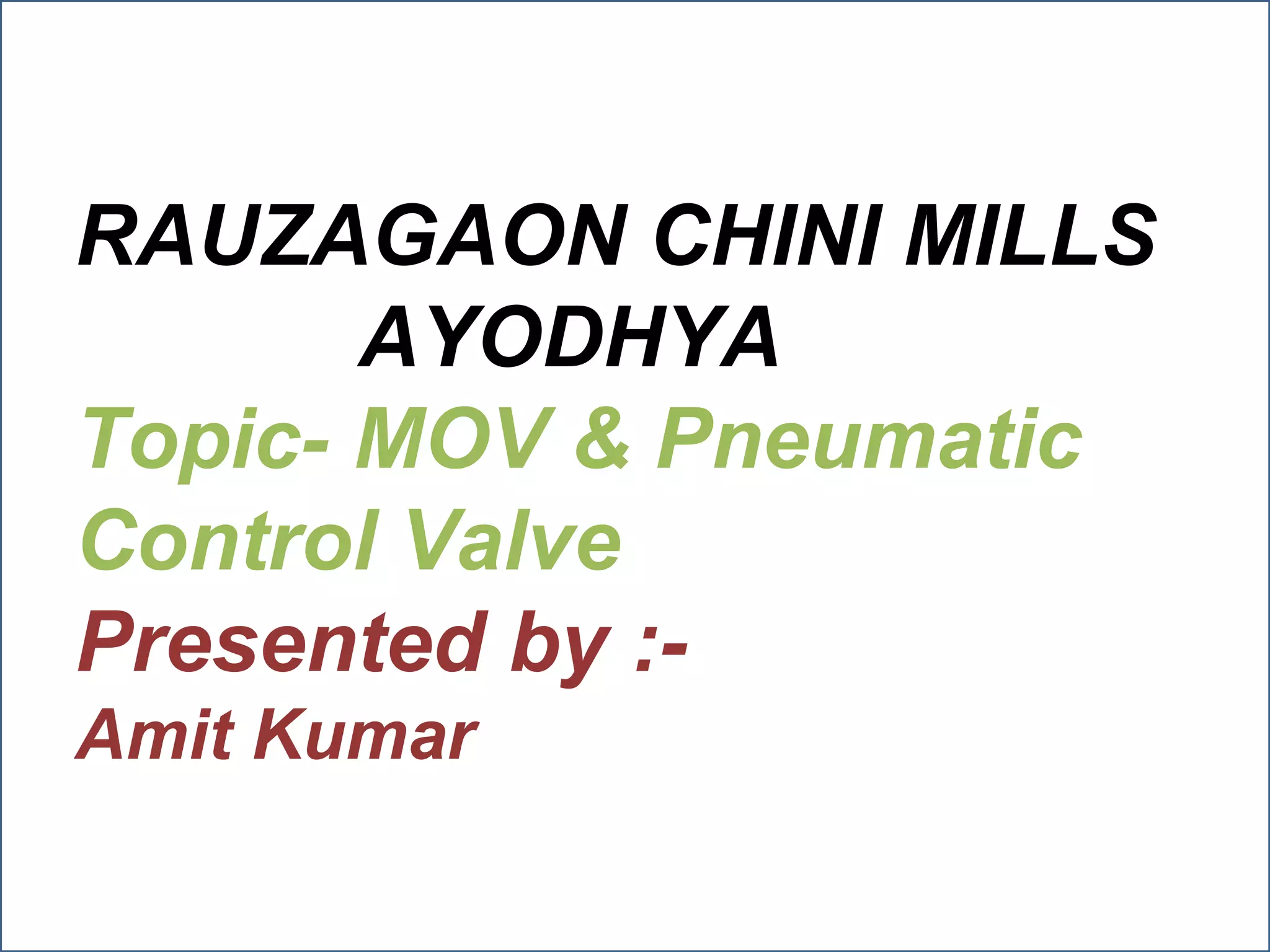 The document discusses MOV (motor operated valves) and pneumatic control valves. It covers the types and applications of MOV, differences between MOV and pneumatic control valves, and problems with MOV. It also discusses pneumatic control valves in more detail, including the main types (air to open and air to close), accessories like regulators and I/P converters, and the working principles of I/P converters and positioners. The document is a presentation on control valves for a course on instrumentation and control basics.