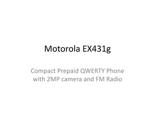 The Motorola EX431g is a compact prepaid phone with a QWERTY keyboard that includes messaging options, a 2MP camera, FM radio with RDS, games and apps, and 3G web access.
