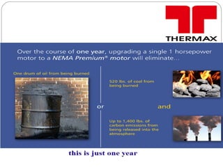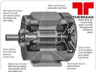 This document provides an overview of electric motors, including different types of motors, their basic principles and components. It discusses induction motors, synchronous motors, and single phase motors. It also covers motor specifications, testing, storage, lubrication, and maintenance practices. The presentation was prepared by Kapil Singh for Thermax Ltd and includes topics like classification of motors, laws of electromagnetism, rotating magnetic fields, and motor applications.