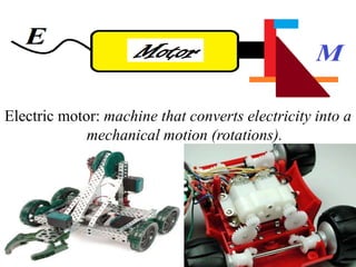 The document discusses different types of electric motors, including stepper, servo, and DC motors, along with their applications. It also covers the use of a motor driver IC (L293D) for controlling motor movements and provides code examples for programming motor functions using AVR. Essential motor commands and configurations for controlling direction and motion of a bot are included.