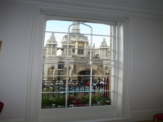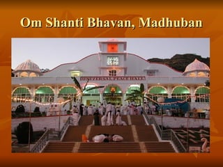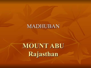 Mount Abu is a hill station in Rajasthan known for its peace retreats and spiritual centers. The document shows images of Om Shanti Bhavan, a dining hall, lake, and solar panels at the Gyan Sarovar complex in Mount Abu. It also features the Global Hospital in Mount Abu and the Global Retreat Centre located in Oxford, England.