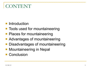 This document summarizes mountaineering, including tools used, popular places for mountaineering, advantages like health benefits, disadvantages like weather risks, and details on mountaineering in Nepal. It discusses equipment like crampons and ropes, locations like the White Mountains and Rocky Mountains, benefits of mountaineering including exercise and stress relief, dangers such as weather and altitude issues, and Nepal's status as a top destination with many challenging peaks.