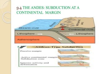 The document discusses three major mountain ranges: the Andes formed by subduction at a continental margin, the Himalayas formed by a collision between continents in India and Eurasia, and mountains' role in Earth's system. Subduction at continental margins leads to uplift of the Andes, while collision between the Indian and Eurasian plates caused the rise of the Himalayas. Mountains impact Earth's climate and environment through effects like erosion and weathering.