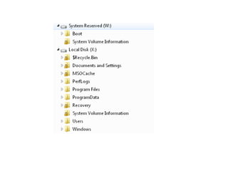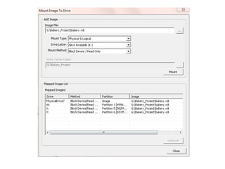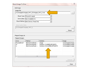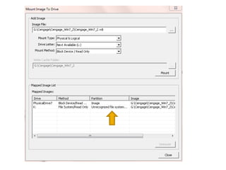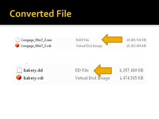Virtual machines allow multiple operating systems to run simultaneously on a single host machine by virtualizing system resources. Common virtual machine programs include Microsoft Virtual PC, Microsoft XP Mode, Oracle VirtualBox, and VMWare. Virtual machine hard drives are typically large files in a format like VHD, VDI, or VMDK that contain the guest operating system and data. FTK Imager can mount these drives to allow forensic analysis of their contents.