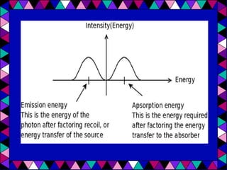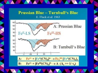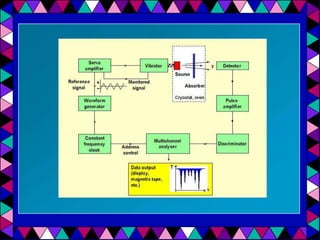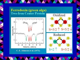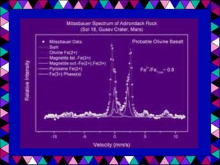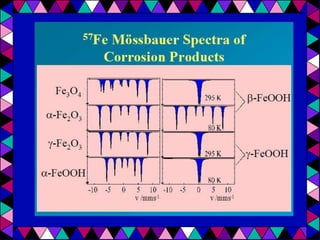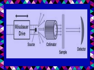 Mössbauer spectroscopy uses the recoil-free emission and absorption of gamma rays to study the chemical environment of atomic nuclei. It provides information on oxidation states, ligands, and magnetic properties by analyzing isomer shifts, quadrupole splitting, and magnetic splitting in spectra. Applications of Mössbauer spectroscopy include distinguishing between chemical complexes, studying iron proteins, identifying corrosion products, analyzing geological samples, and performing in situ analyses on other planets.