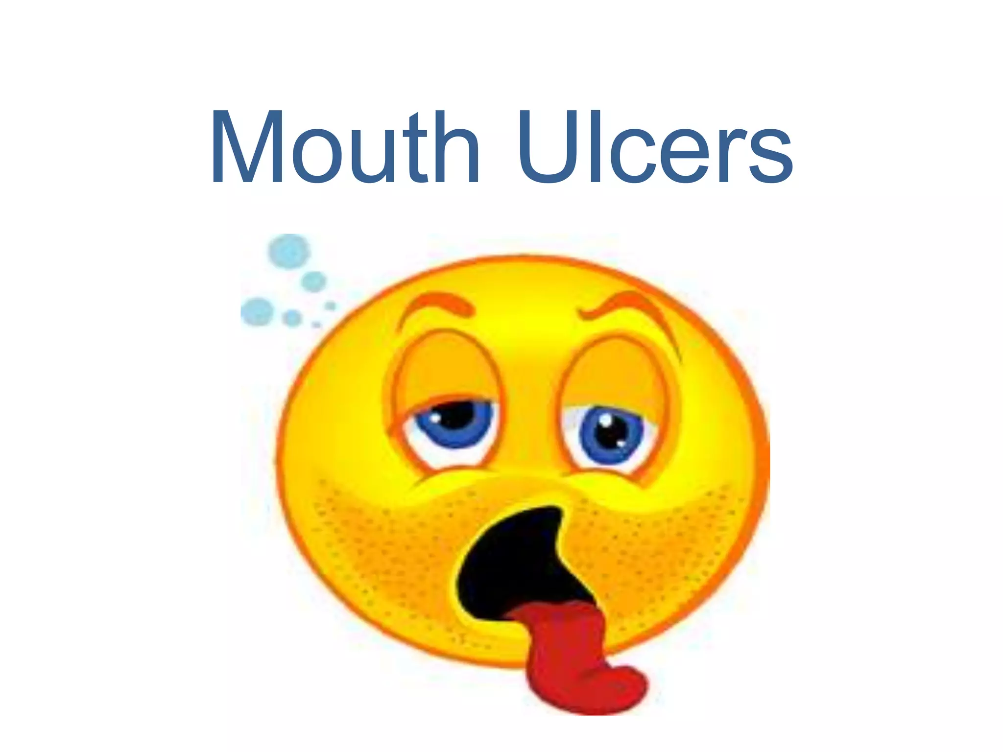 Mouth ulcers are caused by injury to the delicate lining of the mouth from biting, braces, or sharp teeth. Symptoms include painful sores and tenderness making eating difficult. While most heal quickly, some types like aphthous ulcers or those from herpes require medical treatment with anti-inflammatory, antiviral, or antifungal drugs. Prevention focuses on gentle brushing, flossing regularly, and seeing dentist to reduce risk of mechanical injury causing ulcers.