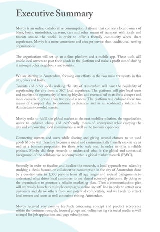 Movby is an online platform that facilitates collaborative consumption by connecting local owners of transportation means such as bikes and boats with locals and tourists in Amsterdam, offering a more affordable and convenient alternative to traditional rental services. The platform aims to empower local communities, promote eco-friendly transportation, and enhance the tourism experience while making it easier for owners to monetize unused goods. Extensive market research and customer feedback have indicated strong interest and potential growth for Movby's services in the shared economy space.