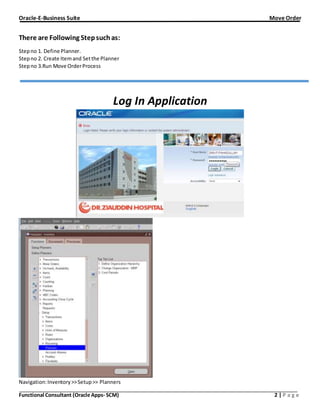 This document outlines the steps to create and process a move order in Oracle E-Business Suite, including defining a planner, creating an item and assigning it a planner, running the move order process, and approving generated move orders. The process involves navigating to the planners and move orders sections in the inventory module and performing actions such as defining a planner, creating an item, running the move order process, and approving move orders.