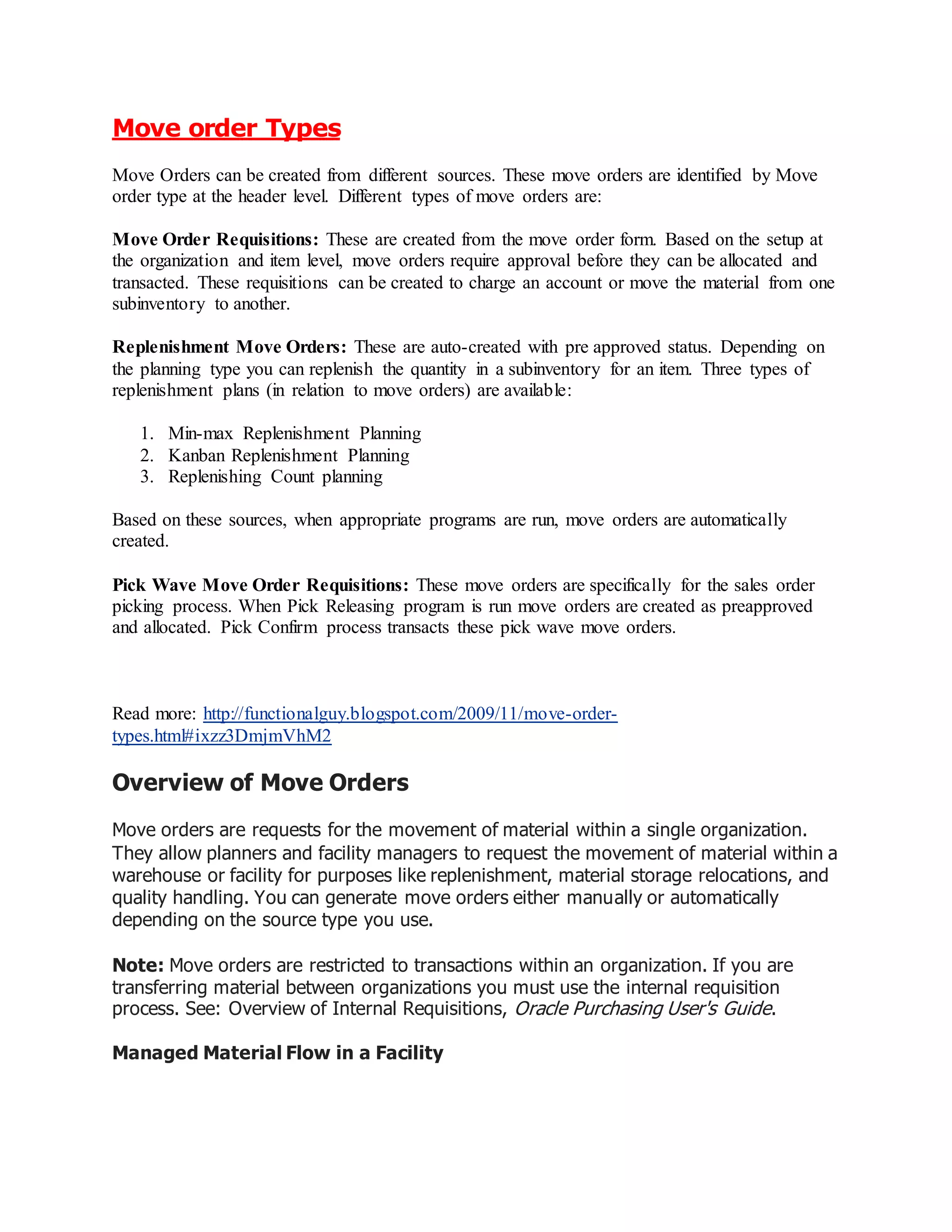 Move orders can be manually created or automatically generated to request the movement of inventory within an organization for purposes such as replenishment, storage relocations, and quality handling, and allow planners to track and manage material flow in a facility through processes like approval, allocation, picking, and transaction. Move order types include manually created move order requisitions as well as automatically generated replenishment move orders for replenishment planning and pick wave move orders for sales order picking.