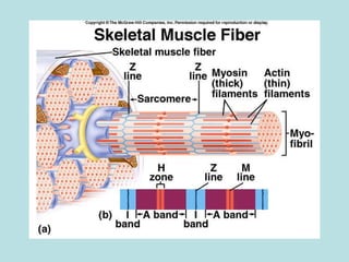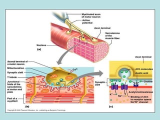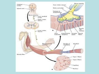 I. The motor unit and structure of muscle tissue. II. The role of neurotransmitters like acetylcholine in stimulating muscle contraction. III. The sliding filament theory of muscle contraction involving calcium ions, troponin, and the myosin power stroke. IV. Types of muscle fibers and muscle contractions including eccentric, concentric, and isometric. V. Types of joint movements and muscle actions. The document also discusses biomechanical concepts such as forces, vectors, Newton's laws of motion, and linear and angular momentum.