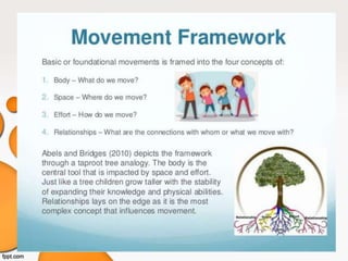 3. The framework is based on the work of movement education pioneers like Rudolph Laban and uses the four elements of body, space, effort, and relationships to structure lessons.