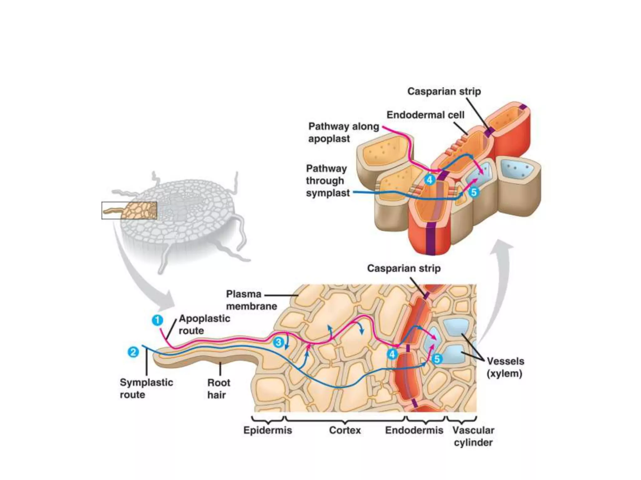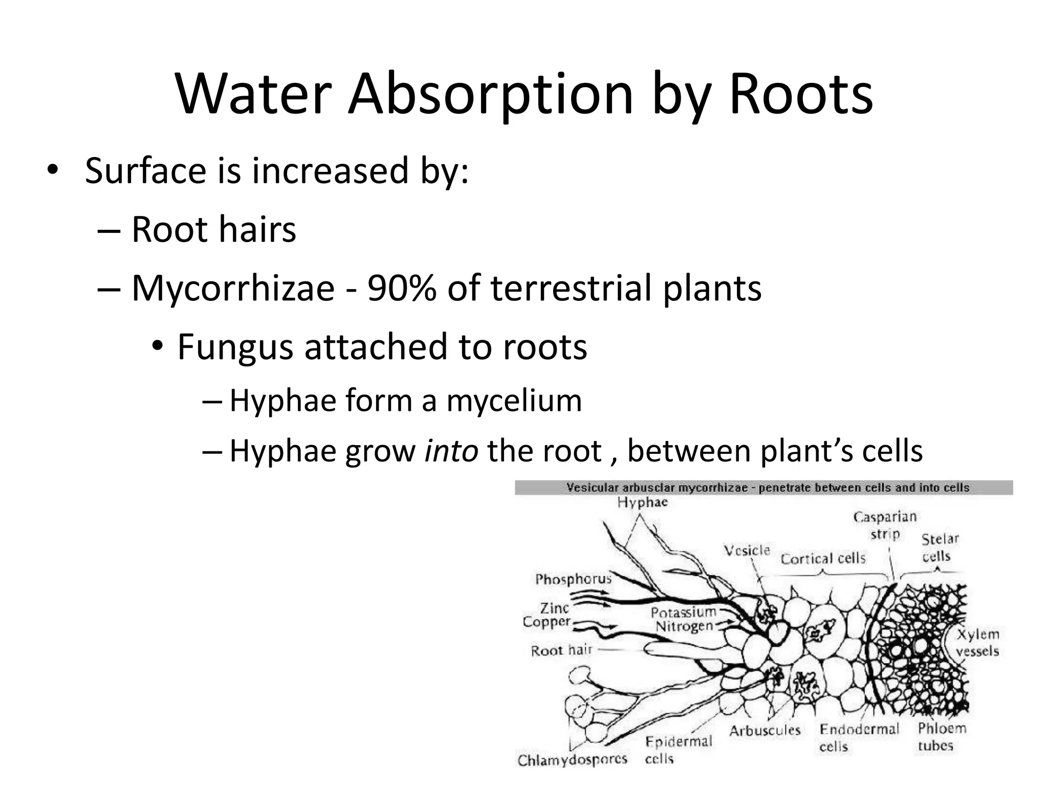 This document discusses the movement of water at the tissue and organ level in plants. It describes how water is absorbed by roots through root hairs and mycorrhizal fungi, then passed through the root cortex to the stele via the apoplast or symplast pathways. The symplast involves movement through plasmodesmata connecting cell cytosols, while the apoplast involves movement through cell walls. Water then moves up through the xylem tracheids and vessel elements to the stem.