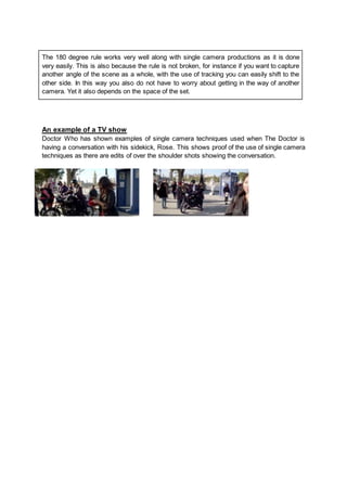 This single camera documentary analyzes the techniques of single camera production. It discusses that a single camera is used per scene, with each shot and angle recorded individually. Single camera production is typically used for low budget projects like music videos and trailers. Scenes are filmed entirely before moving on, which allows more directorial control but is more time consuming. An alternative is to use two cameras to capture medium and closeup shots simultaneously, reducing the number of setups needed. Pros of single camera include low budget, flexibility of shots, and ease of gathering footage. Cons include the time needed to reposition the camera and the lack of alternative angles if the camera is damaged. Examples provided are from films like Doctor Who that use over-