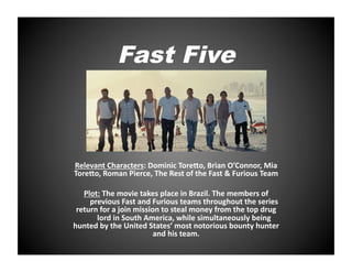 The movie Fast Five follows Dominic Toretto, Brian O'Connor, and members of their team as they plan a heist in Brazil. Their mission is to steal money from a powerful drug lord while evading capture from a notorious bounty hunter. The team must work together effectively using both verbal and nonverbal communication despite cultural differences as they coordinate their complex plan, support each other, resolve conflicts, and leverage their intimate relationships and workplace skills to succeed in their dangerous mission.