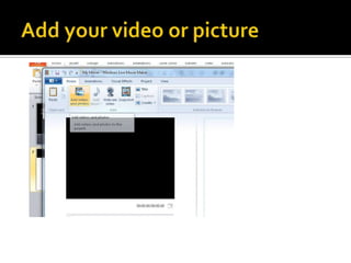This document provides instructions for editing video using Live Movie Maker, including trimming clips, splitting clips, adding transitions, still images, narration, and adjusting audio levels. Key steps include using trim and split tools to edit video segments, selecting animations to add transitions between clips, adding still images and audio files, and adjusting audio levels in the project tab.
