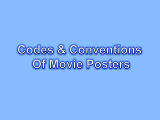 The document discusses different types of movie posters and their purposes. It explains that movie posters are used to promote and advertise upcoming films. Posters come in different types, including teaser posters, official release posters, and DVD posters. Key elements of movie posters typically include the title, actors, release date, taglines, and images related to the genre and plot. The document then analyzes examples of posters, noting design elements and how they provide clues about the genre and story.