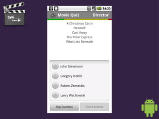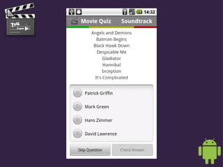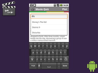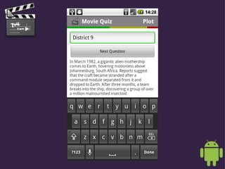 This document describes a movie quiz app that allows users to test their knowledge of movie plots, casts, directors, and soundtracks. It provides information on how users can access the app, which is currently in a private beta but will be released for free download on the Android Market in late September 2010. It also notes that the app was developed using over 2400 Wikipedia articles and SQLite for offline play, with analytics and device optimizations to create a challenging quiz experience.