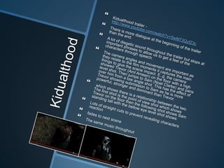 This document summarizes and provides feedback on several movie trailers. It discusses the effective use of dialogue, sound, camera angles, music, captions, and tag lines in trailers for films like Kidualthood, Bullet Boy, and Poetic Justice. Specific shots and sequencing of events are proposed for a hypothetical trailer about a couple that breaks up after high school but reunite years later, with violence ensuing as one tries to reclaim the relationship. Overall themes of love, loss, and danger are highlighted.