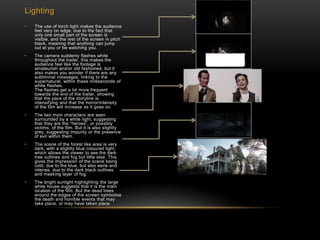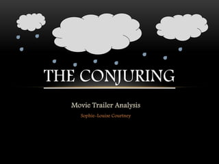 The document analyzes the trailer for the horror film "The Conjuring" through its use of lighting, mise-en-scene, editing, camera angles, titles, sound, and other elements. It notes that the lighting creates an unsettling atmosphere and that flashes may contain subliminal messages. The costumes connect the main characters to the past and contrast with modern students. Fast editing and camera motion prevent viewers from focusing on any one scene. Distorted titles and dramatic vocabulary aim to intrigue viewers. Screams and crashing sounds heighten fear without showing the source, creating dread of the unknown.