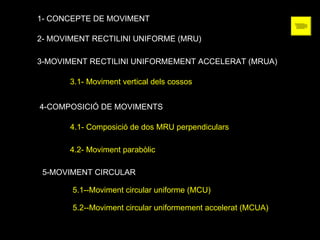 ∆ S (espaien metres) = ∆ ( angle en rad ) · R V (velocitat) = (velocitat angular ) · R a t (acceleració tangencial) = (acceleració angular) · R 6-Classificació dels moviments segons l’acceleració Moviments rectilinis a n = 0 Moviment rectilini uniforme (MRU) a t = 0 Moviment rectilini uniformement accelerat (MRUA) a t 0 Moviments circulars a n 0 i R = cte Moviment circular uniforme (MCU) a t = 0 Moviment circular uniformement accelerat (MCUA) a t = cte magnitud lineal= magnitud angular · radi