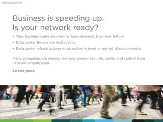 The document explores the advantages of network virtualization, emphasizing its ability to enhance security, agility, and control for businesses. Organizations using VMware NSX have reported improved app continuity and automated IT processes, allowing for rapid network changes and greater threat isolation. Case studies highlight benefits experienced by various entities, demonstrating that network virtualization is essential for meeting modern business demands.