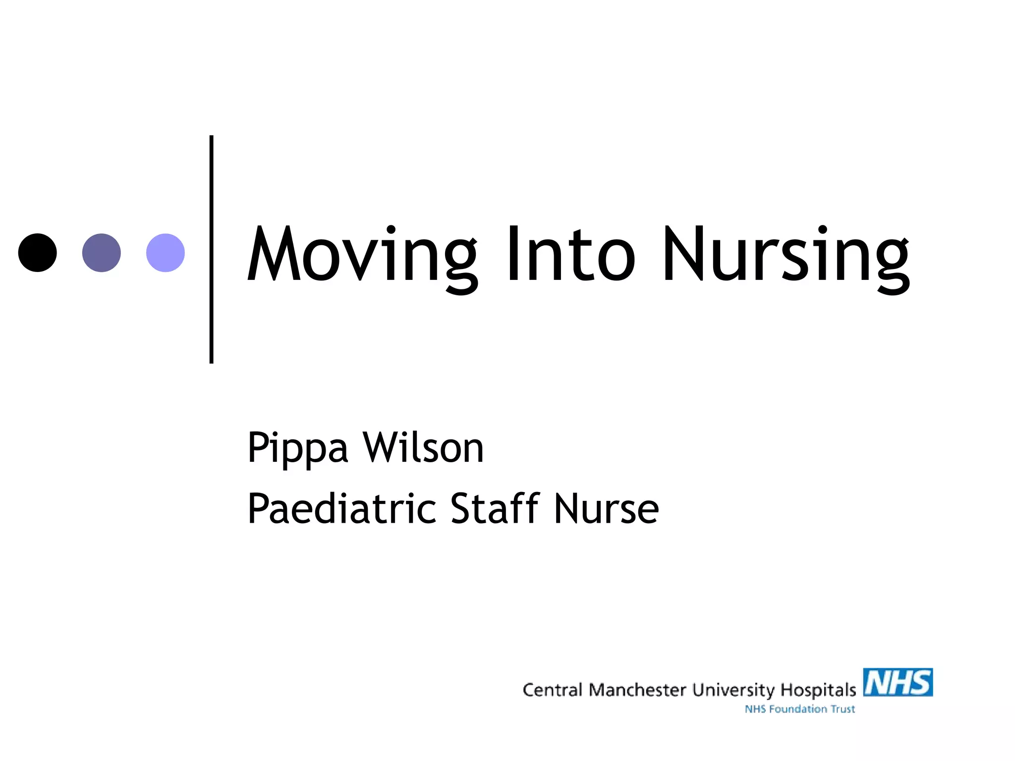 Pippa Wilson is a paediatric staff nurse who graduated with a degree in medical biochemistry in 2005 and a postgraduate diploma in children's nursing in 2008. She currently works as both a staff nurse on a paediatric ward and part-time as a paediatric diabetes nurse specialist. Her roles involve caring for patients aged 0-16, administering medications, communicating with patients and their families, and teaching nursing students and colleagues. While her biological science degree knowledge is not directly used as a staff nurse, it has provided a helpful foundation for her work in specialties like diabetes nursing. She finds nursing fulfilling as it allows her to help vulnerable patients while continuing her education and taking on new opportunities.