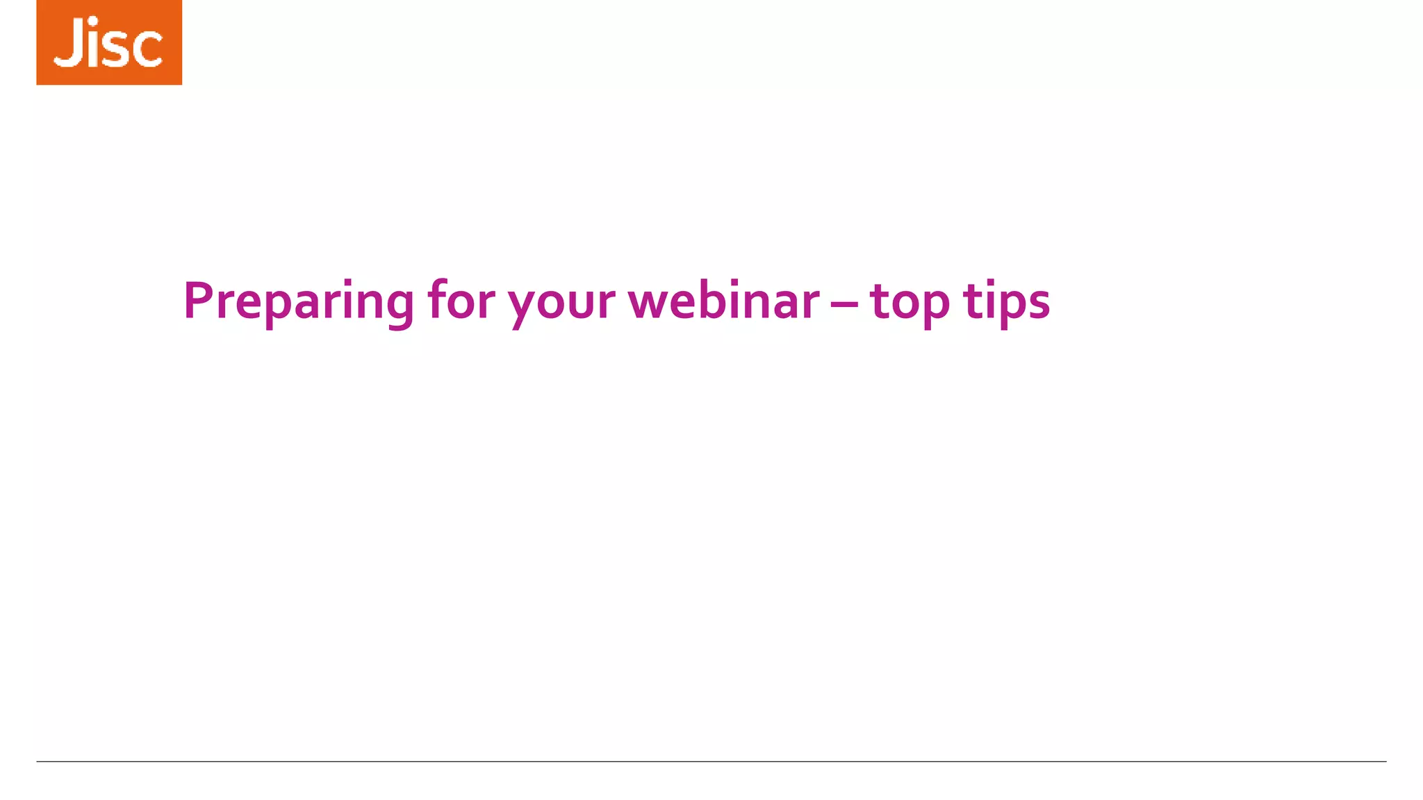 The document provides tips for preparing and presenting webinars. For preparation, it recommends sending information for participants to test their systems, having backup plans for technical issues, considering the tools and bandwidth needs of participants, and organizing the presentation space. It also suggests building in participant interactions, planning for contingencies, and managing questions. For presenting, it advises setting timers, recording the session, providing checklists and personal greetings for participants, explaining the presentation tools, introducing the topic and format, including interactivity, and managing questions. The final tips are to rehearse and relax during the presentation.