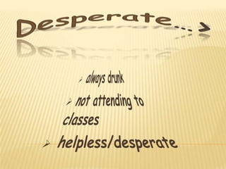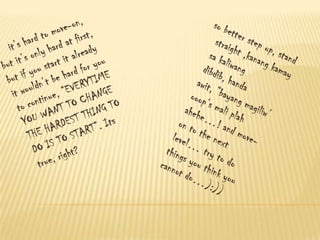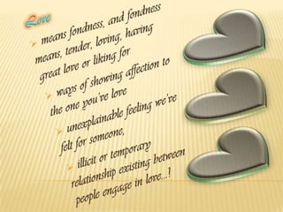 This presentation provides advice on how to move on from heartaches. It includes a definition of love through a narration, a video of a crying lady, and related pictures. It warns of possible consequences of not moving on, such as suicide, failing grades from an inability to concentrate, alcoholism, and illness. The presentation defines moving on as recovering from a state of being moved by emotion. It recommends ignoring thoughts of the past, opening up to others, and keeping busy as ways to move on from heartache. It was prepared by Mary anne m. Barquilla of beed 1-a (n).