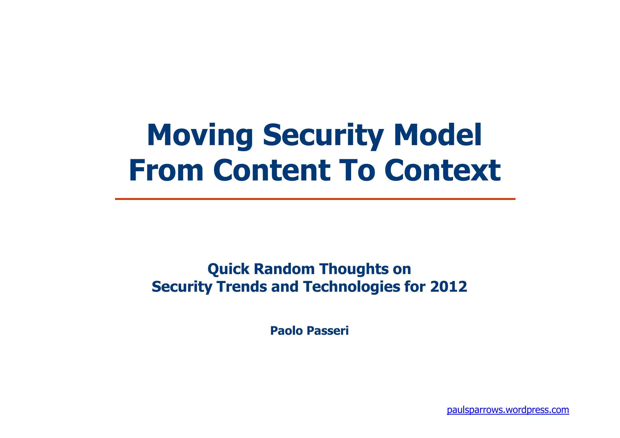 The document discusses the evolution of security technologies, emphasizing the need to transition from content-based security models to context-aware systems due to the increasing sophistication of malware and advanced persistent threats (APTs). It highlights the role of next-generation intrusion prevention systems (NG-IPS) and web application firewalls (WAFs) in defending against contemporary cyber threats, while also pointing out the importance of addressing human vulnerabilities as a primary focus in cybersecurity. The document concludes with references to previous writings on security advancements and the significance of adapting to a changing threat landscape.